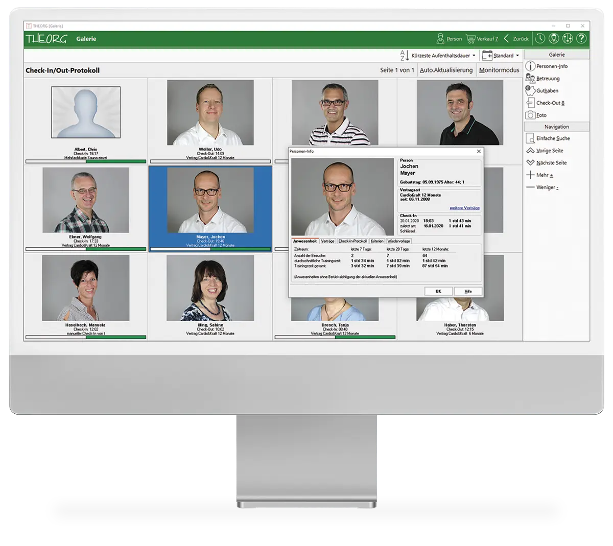 In der Galerie bekommen Sie einen schnellen Überblick über alle eingecheckten Mitglieder zur Anwesenheitskontrolle. Aussagekräftige Statistiken zur Auslastung der Trainingsfläche, Trainingshäufigkeit oder längere Abwesenheiten erhalten Sie auf Knopfdruck.