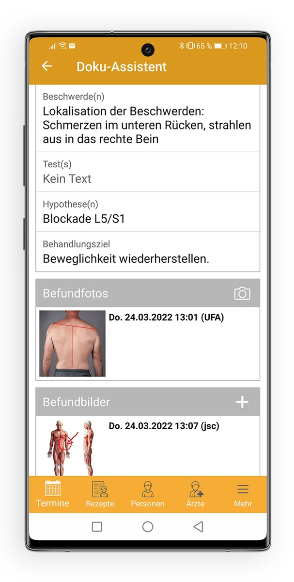 Auch bei Selbstzahlerleistungen in der Physiotherapie sorgt der Dokumentations-Assistentin für eine einfache und lückenlose Erfassung von Behandlung und Verlauf.